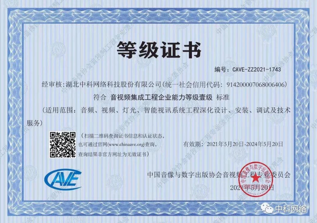 喜訊:中科網(wǎng)絡(luò)成功取得“音視頻集成工程企業(yè)資質(zhì) 壹級(jí)”證書